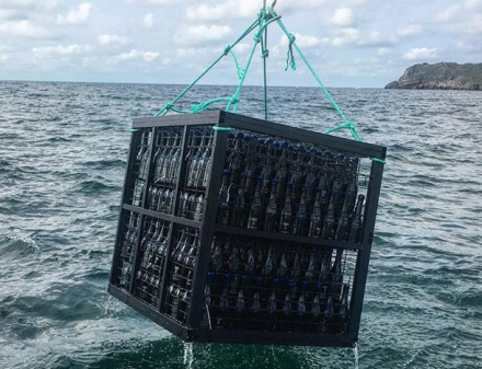 Derefter sænkes flaskerne 20 meter ned under havoverfladen i et stort metalbur. Der bliver de liggende i mellem et halvt og et helt år.