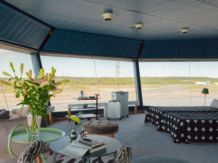 Det gamle kontroltårn i Arlanda Lufthavn i Stockholm er blevet gennemrenoveret, og der er blevet indrettet en lækker lejlighed i de specielle lokaler.