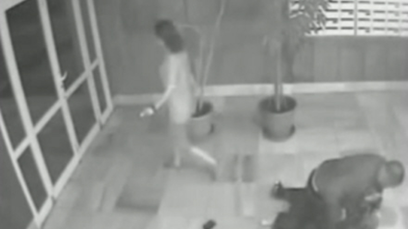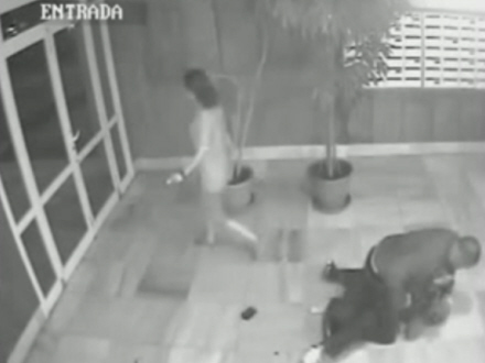 Hun kommer dog tilbage, samler et eller andet op, som en af de to mænd muligvis har tabt, og afleverer det til overfaldsmanden, der fortsat sidder overskrævs på offeret.Det ser ud til, at hun siger noget, men virker ikke synderligt oprevet.