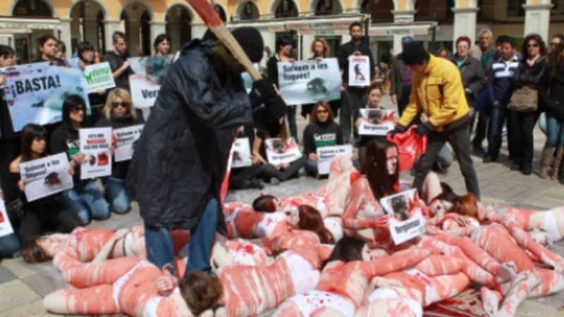 En gruppe unge gennemførte i går en storstilet aktion på Plaza Mayor i Palma de Mallorca i protest mod massedrab af sæl-unger i Terranova i ...