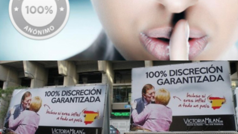 Dating-sitet Victoria Milan har ophængt hundredvis af plakater med et billede af Rajoy, der kysser Tysklands kansler Angela Merkel, under sloganet ”100 procent diskretion garanteret. Selv om du snyder et helt land”.