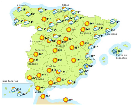 I den nordlige del af landet falder dagtemperaturen til mellem ti og 12 grader, mens den i de sydlige egne kommer til at ligge på omkring 17 grader – et dyk på ca ti grader i forhold til de foregående dage. Det bliver samtidig meget blæsende langs de nordvestlige kyster, og i Galicien er der varsel om bølger på mellem fem og syv meters højde. Også på Balearerne bliver det meget blæsende.