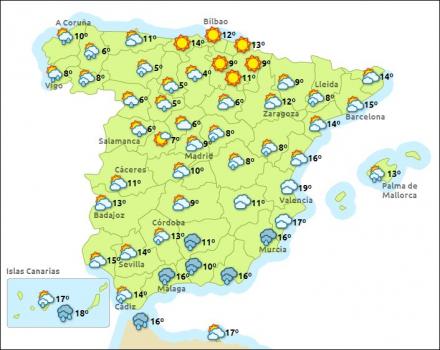 Fredag er der gult alarmberedskab på grund af nedbør i den vestlige del af Málaga-provinsen. Mest nedbør forventer meteorologerne i Guadalhorce-dalen, Ronda og Antequera. Dele af Midtspanien er også i forhøjet alarmberedskab på grund af udsigt til sne, og hele den nordvestlige del af landet samt dele af Kanarieøerne er i alarmberedskab på grund af hård sø og høje bølger.