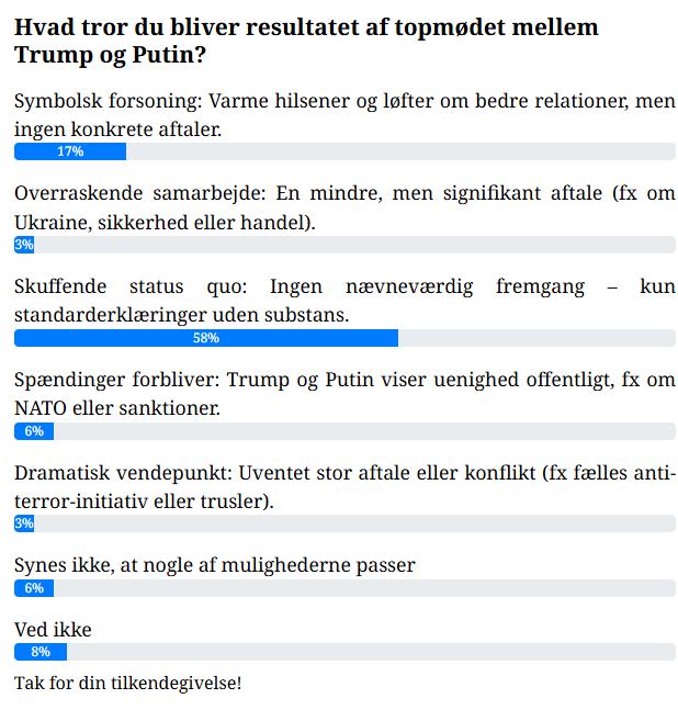 - Trump har opfyldt ønsket om ikke at lave en aftale om Ukraine uden Zelenskys og Europas tilstedeværelse.