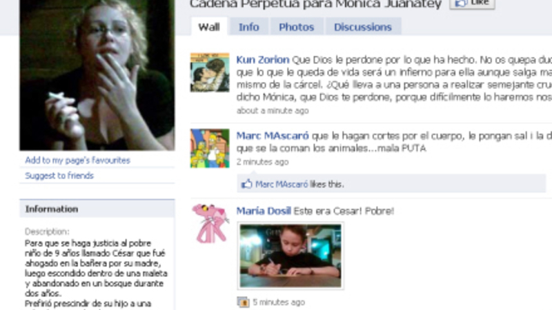 Bare 24 timer efter at den 30-årige Monica Juanatey tilstod, at hun havde dræbt sin 9-årige søn og gemt lig-resterne i en kuffert, gik forargede borgere i gang med deres egen offentlige rettergang på sociale netværk som Facebook.