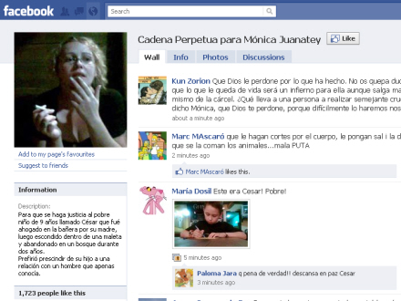 En anden støttegruppe, som kalder sig for "Cadena Perpetua para Mónica Juanatey", indsamler underskrifter for, at kvinden blive idømt livsvarigt fængsel for sin ugerning (foto). I skrivende stund har over 1700 personer allerede tilmeldt sig.