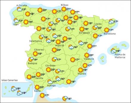 Madrid, efterhånden skyet, syv – 22 grader, Barcelona vekslende skydække, 11 – 19, Valencia, letskyet, ti – 22 og Málaga, letskyet 13 – 21 grader.