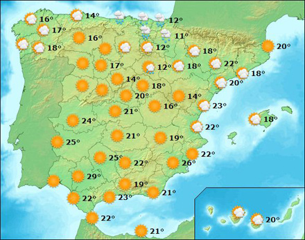 Meget tyder da også på, at maj i år kommer til at gå over i historien som en af de køligste i mange år. I Pyrenæerne er der fortsat mulighed for sne, mens der kommer en del nedbør i Cantabrien. I resten af landet ret solrigt og tørt og med stigende temperaturer.