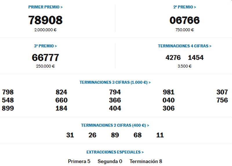 Andenpræmien faldt på 06766 og tredjepræmien på 66777, som begge er bredt distribueret i hele Spanien.