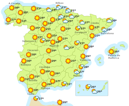 Madrid får i dag mellem 17 – 31 grader, Barcelona 18 – 29, Valencia 19 - 30 og Málaga 20 – 27 grader.