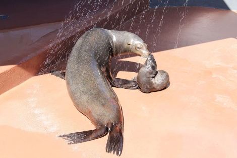 Søløveungen har allerede tiltrukket stimevis af nysgerrige, som gerne vil have et glimt af lille grå klump, når hun leger i brusebadet med sin mor.