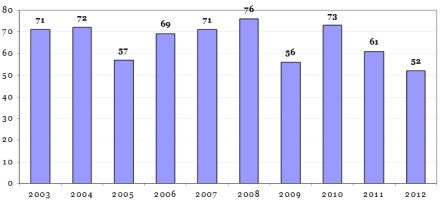 I 2013, der ikke er med på grafikken, var antallet 54