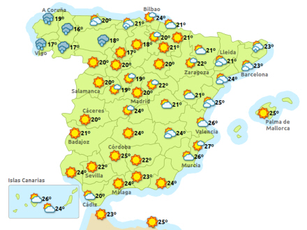 Vejret i Spanien, mandag klokken 14:00