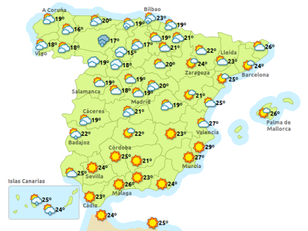 Vejret i Spanien, tirsdag klokken 14:00