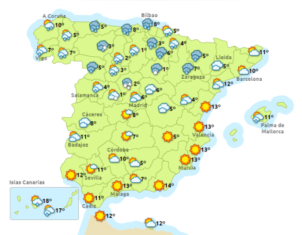 Dagstemperaturerne falder på Balearerne og på den sydlige tredjedel af halvøen, mens den er stigende ved Middelhavskysten. Nattemperaturerne falder på den sydlige og østlige del af halvøen. Frost på store dele af den nordlige og østlige del af halvøen.