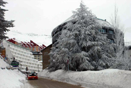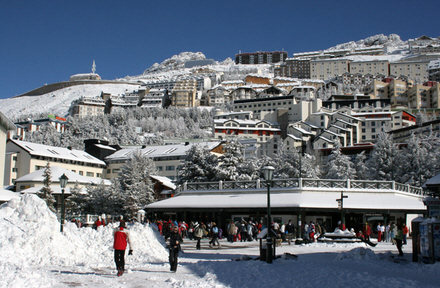 Ankomsten til Sierra Nevada, Pradollano, er imponerende. Den kæmpe parkeringskælder, som den nye bydel er bygget ovenpå, ligger til højre.