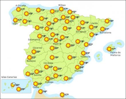 Madrid har i dag ret solrigt vejr med mellem syv - 22 grader, Barcelona sol og ti – 20 frader, Valencia ligeledes sol og mellem 12 – 25 grader og endelig Málaga solrigt og mellem 11 – 24 grader.