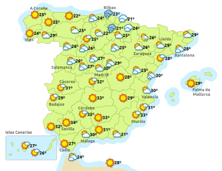 Madrid har i dag fint og solrigt vejr med 19 til 33 grader, men det bliver efterhånden mere blæsende, Barcelona mest skyet, men dog også en smule sol med 22 til 28 grader, Valencia letskyet og 23 til 31 grader, Málaga letskyet med efterhånden solrigt, svag vind og 24 til 33 grader.