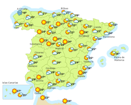Meteorologisk Institut, Aemet, melder om mulighed for byger og tordenvejr.