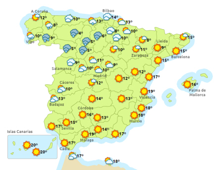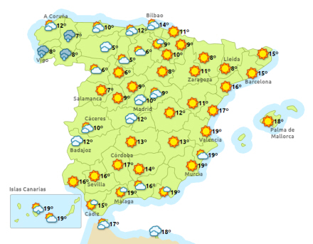 Madrid er blevet vækket af en sol der har kastet sien stråler ned over byen fra en skyfri himmel. Sådan fortsætter det dog ikke hele dagen. Ved middagstid kommer der et par enkelte skyer på himlen, men ikke mange. Temperaturen bliver mellem 2 og 8 grader.