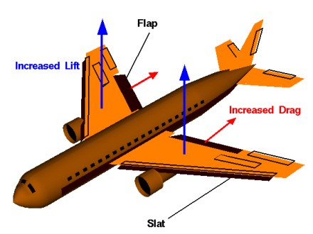 Med andre ord gøres vingen bredere og slats'ene ændrer vindens passage over vingen, så undertrykket bliver kraftigere.