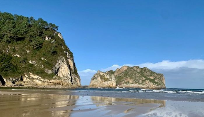 Strandene er vilde og uden parasoller på række. Bjergene i Picos de Europa rejser sig dramatisk.
