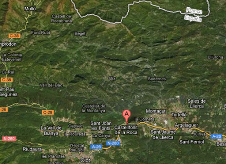 Beliggende i Girona Provinsen er byen omgivet af to floder; Fluvia og Toronell. De to floder har gennem tiderne eroderet jorden hele vejen rundt om klippeskrænten og altså blot efterladt ”knuden” i midten med byen på toppen.