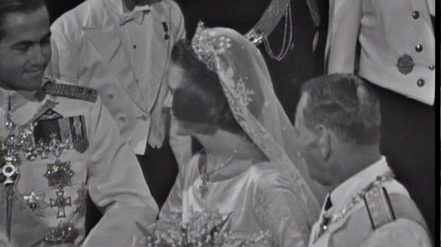 Kong Frederik 9. fører Prinsesse Anne-Marie op ad kirkegulvet den 18. september 1964 i Metropolis-katedralen i Athen