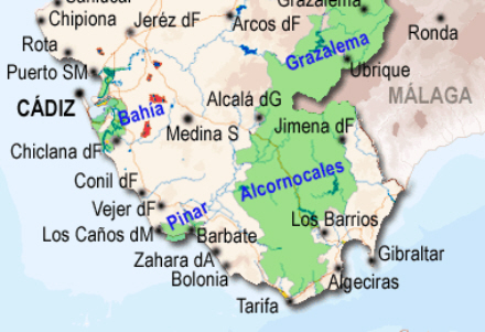 Vi drejede af ved Los Barrios i Algeciras ad A-381 og kørte 18 kilometer nordpå til afkørsel CA-212 mod Benalup-Casas Viejas. Landskabet ændrede sig hurtigt fra at være et svedent kystparti til kæmpe skovområder med fyrretræer, korktræer og de egnstypiske pinje-træer, der kendetegner den vindblæste Cádiz Provins.