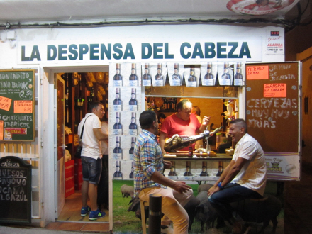 VI kom også forbi en bar, der tilhører "ham med det store hoved", der skærer landskinke lige ved vinduet. Vi kikkede efter, og det er helt rigtigt: Mandens hoved er enormt.