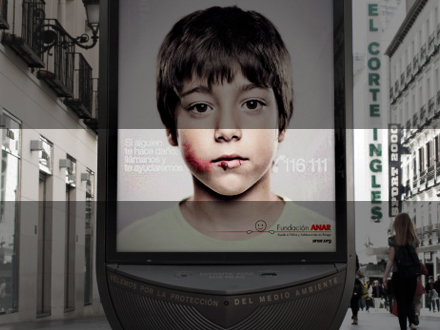 Mens voksne ser en generel annonce, der oplyser om overgreb mod børn med et nærbillede en dreng, så ser børn under en vis højde den samme dreng men forslået samt et nummer til en hjælpe-hotline og meddelelsen: "Hvis nogen gør dig ondt, så ring til os, og vi vil hjælpe dig".