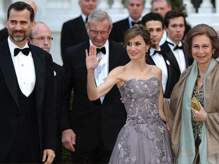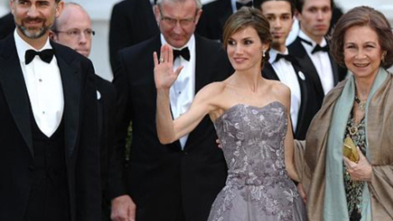 Dronning Sofia var iklædt en blomstret kjole holdt i diskrete jordfarver, kronprinsen i sort og hvidt - som det sig hør og bør - mens Letizia havde valgt en mere moderne og ung strop-løs kjole i chiffon og tyl i grå-brune toner.