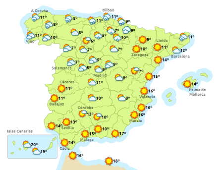 Du skal ikke forvente de store forandringer på termometeret med mindre du sidder i Ebro-dalen, hvor det kan blive lidt lunere i dagtimerne, og så kommer der let frost i højtliggende egne i den nordlige del af fastlandet – koldest i Pyrenæerne.