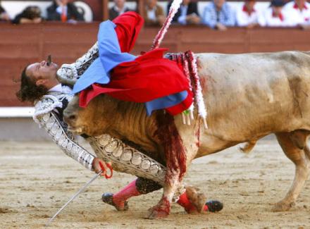 Tyren tog føringen halvvejs inde i kampen, da Julio Aparicio ved et uheld mistede balancen og snublede. Selv om tyrefægteren hurtigt forsøgte at komme på benene igen, så tyren sit snit til at gå til angreb på sit offer og borede sit ene horn op gennem tyrefægterens hageparti.