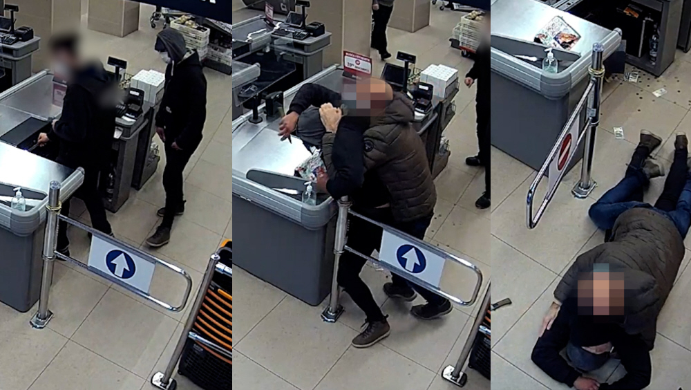 Da han nærmede sig, kunne han se, at den mistænkelige mand var i færd med at pille ved kassen, hvorefter betjenten foretog en hurtig manøvre for at pacificere ham. På trods af mandens modstand kunne betjenten, da de lå sammen på gulvet, se, at han holdt et bundt pengesedler i den ene hånd og en stor kniv i den anden. Men røveren kunne ikke røre sig.