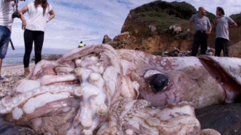 En kæmpe blæksprutte er skyllet i land i det nordlige Spanien. Monsteret, der måler hele ni meter, skabte både forbløffelse og afsky blandt lokalbefolkningen.