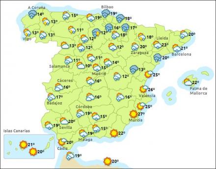 Madrid, skyet, regn og torden, 10 – 17 grader, Barcelona, opklaring, 17 – 21 Valencia, efterhånden sol, 17 – 24, Málaga, opklaring, 16 – 19 grader.