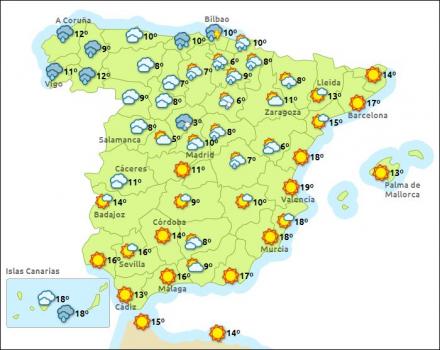 Talsmand for Meteorologisk Institut, Aemet, Ana Casals, siger, at foråret kommer i løbet af i morgen med en del sol og varme over de nordlige egne. I resten af landet bliver det skyet til letskyet og langs Middelhavskysterne kommer der en del sol.