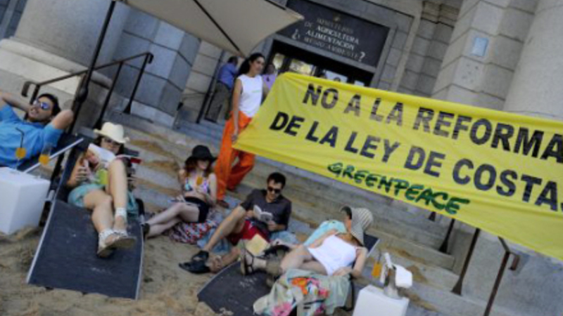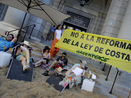 Men det var hverken solhungrende nordboere eller storbybeboere på privat luksusstrand i hjertet af hovedstaden, men derimod Greenpeace-aktivister. På en mildest talt anderledes måde protesterede de mod regeringens nye kystlov, som giver grønt lys for privatisering og legalisering af ulovligt byggeri langt de spanske kyster.