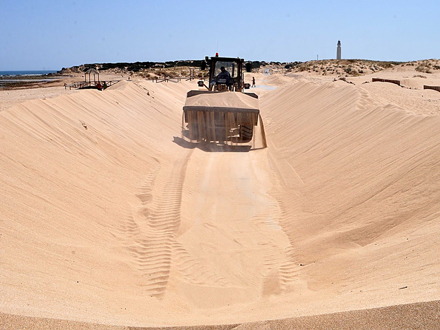 Det er strækningen til fyret ved Trafalgar i Caños de Meca i Cádiz, der er sandet godt og grundet til. 40 husstande i området er sandet inde. De er nødt til at lade bilen stå og vandre flere kilometer, hvis de skal ud.