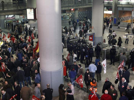 Strejkevagter og politi på Atocha-stationen i Madrid