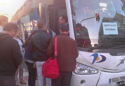 Busstationen i Fuengirola kl. 8:30 i morges. Chaufføren har travlt med at forklare passager om de manglende afgange