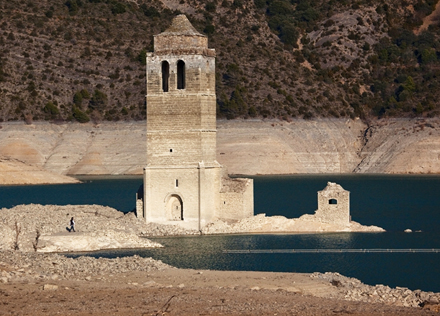 En kirke og resterne af en gammel landsby kaldet Mediano, der normalt er dækket af vand i et reservoir i Huesca, Spanien
