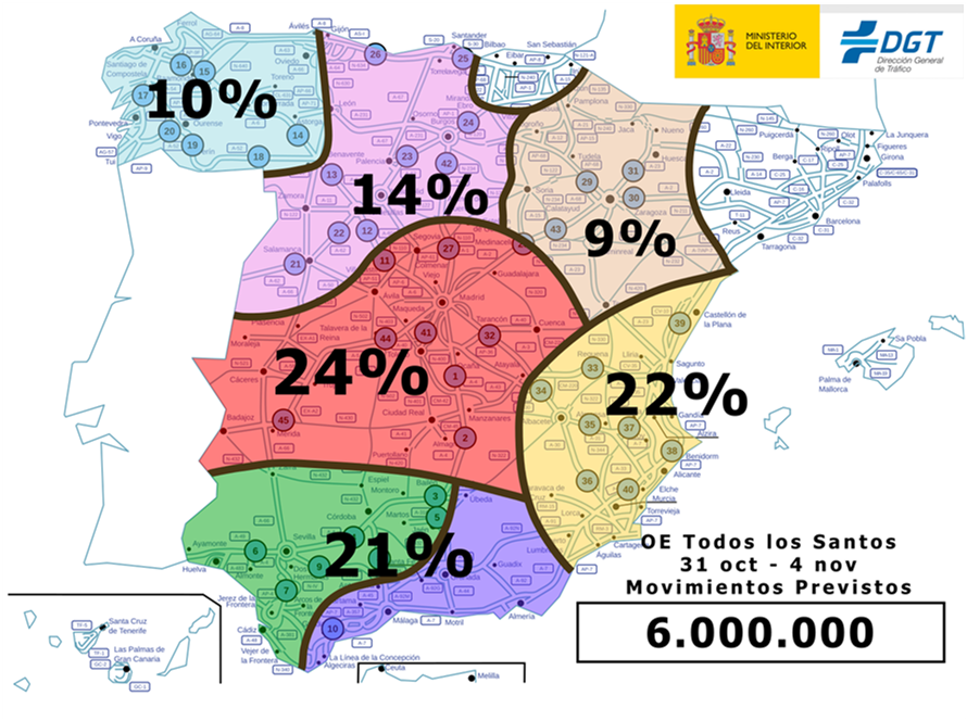 DGT oplyser, at den tætte trafik starter i dag klokken 15 og fortsætter frem til midnat søndag den 4. november.