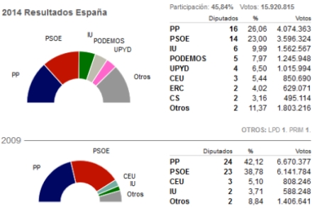 Selvom Spaniens premierminister Mariano Rajoy kraftigt advarede offentligheden mod at gå efter de små parter fordi det ville være spild af stemmer, så skovlede det nye venstreorienterede borgerparti Podemos (”Vi kan”) hele fem pladser i Europa-Parlamentet, og kommer ind på en fjerdeplads.