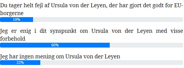 Jeg er selvfølgelig meget glad for, at 60 procent af vores læsere delte min opfattelse. At 22 procent ikke havde nogen opfattelse af Ursula von der Leyen, tager jeg som et udtryk for, at hun ikke har formået at skabe nærhed til EU-borgerne. Specielt er jeg glad for de 18 procent, der mente, at jeg tog helt fejl af Ursula von der Leyen. Vigtig information for os.