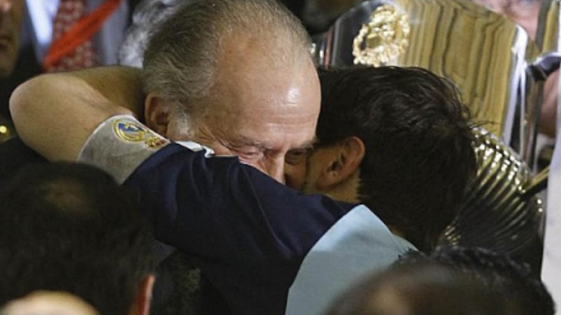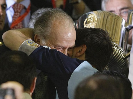 Real Madrids målmand og anfører fik overrakt pokalen af Kong Juan Carlos oppe på tribunen, hvor han fik et ordentligt royalt kram med i tillæg. Da han skulle op at stå på kanten af tribunen, måtte Casillas også støtte sig til nogen - både da han skulle op og ned igen - for ikke at skvatte ned. Og kongen lagde velvilligt skulder til.