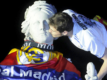 Iker Casillas giverstatuen på Plaza Cibeles et kindkys, efter han har givet hende Real Madrid flag og tørklæde på