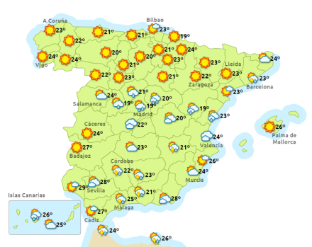 Vejret i Spanien, onsdag klokken 14:00