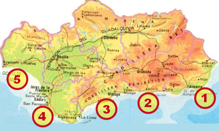Kystlinjen omfatter Costa Almería (1), Costa Tropical i Granada (2), Costa del Sol i Málaga (3), Costa de la Luz i Cádiz (4) og Costa de la Luz i Huelva (5)